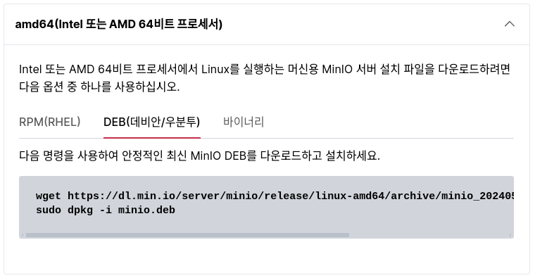 MinIO 라는 SDS(Software Define Storage) 설치 방법에 대해서 소개하고자 한다. 간단하게 설치 사용할 수 있는 장점이 있어 테스트 및 소형으로 운영이 가능할 것으로 보인다. 본 내용은 Single-Node에 설치하는 방법에 대하여 설명하였다. 1. OS 설치MinIO는 RHEL 또는 Debian/Ubuntu 계열에 대하여 지원하고 있으며, 설치 테스트를 위하여 Ubuntu 22.04.4 LTS 설치하였다. 2. Network 설정모든 서버의 네트워크 설정은 고정 IP을 사용하도록 한다.minio:~$ sudo vi /etc/netplan/00-installer-config.yaml# This is the network config written by 'subiquity'n..